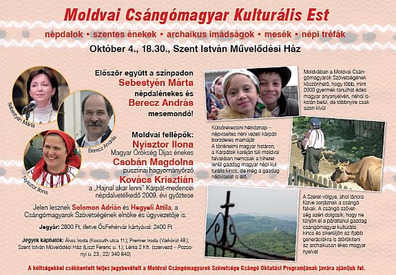 Jó ügyet támogathat, aki részt vesz az október 4-én megrendezésre kerülő Csángómagyar Kulturális esten: a rendezvény költségekkel csökkentett teljes jegybevételét a Moldvai Csángómagyarok Szövetsége Csángó Oktatási Programjának javára szánják. Az est október 4-én 18:30-kor kezdődik.