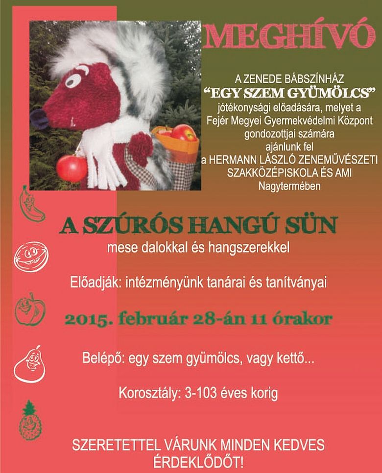 2015. február 28-án, szombaton délelőtt 11 órakor jótékonysági előadást szervez „Egy szem gyümölcs” címmel a Zenede Bábszínház, melyet a Fejér Megyei Gyermekvédelmi Központ gondozottjai számára ajánlanak fel. A Hermann László Zeneművészeti Szakközépiskola és AMI-ban A szúrós hangú sün című darabot tekinthetik meg az érdeklődők, az intézmény tanárainak és tanítványainak előadásában.