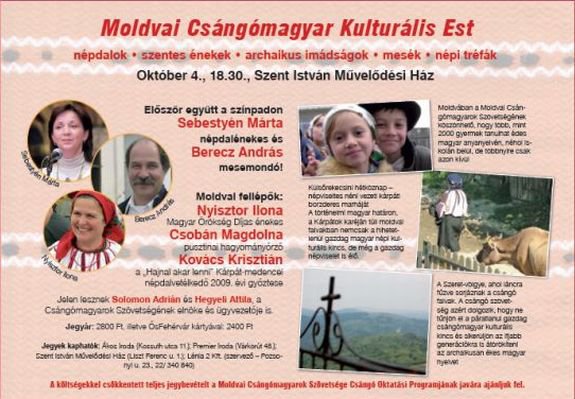 A moldvai magyar oktatás támogatására szervezett jótékonysági estre hívják az érdeklődőket. A Szent István Művelődési Házban október 4-én (kedden) 18.30 órakor kezdődő program bevételéből a Moldvai Csángómagyarok Szövetségét segítik, a szervezet 24 településen biztosítja kétezer gyermeknek az anyanyelv tanulását. Az esten fellép többek között a Magyar Kultúra Követe kitüntető címet is viselő Sebestyén Márta népdalénekes, aki először szerepel Berecz András Kossuth-díjas népdalénekes-mesemondóval.