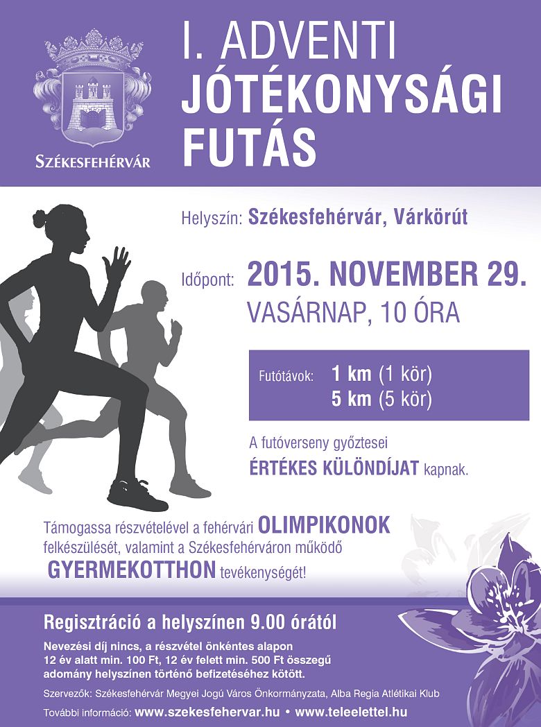 „Azok is segíthetik a gyermekotthont és a fehérvári sportolókat, akik részt vesznek az Advent első vasárnapján rendezendő jótékonysági futáson. A felújított Várkörúton egy, illetve öt körön futhatnak a jelentkezők, egy kör egy kilométer távot jelent. Vagyis különösebb edzés nélkül is rajthoz állhat bárki. Önkéntes alapon, akár pár száz forinttal is nevezhetnek a futásra, akik mozogni és segíteni akarnak. A 12 éven alattiak között elsőként célba érkező gyermek aznap este együtt gyújthatja meg a város első adventi gyertyáját a belvárosi színpadon a polgármesterrel. Az 5 kilométer győztese pedig párjával együtt meghívót kap a jótékonysági estélyre” - mondta Miklósa Erika, aki kiemelte az ARAK szakmai segítségét az I. Adventi Jótékonysági Futás lebonyolításában.