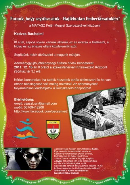 Lajkó Csaba székesfehérvári ultramaraton futó a MATASZ Fejér Megyei Szervezetével közösen 2011. december 18-án, vasárnap 08.00 órától hat órás adománygyűjtő jótékonysági futásra hívja a város sportszerető és segíteni szándékozó lakosait. A találkozó a székesfehérvári Kríziskezelő Központ előtt lesz a Sörház tér 3-ban. A szervezők célja, hogy a fehérváriak figyelmét a hajléktalan embertársaikra irányítsák és segítsenek nekik a hideg évszak könnyebb átvészelésében, hiszen nekik a tél a túlélésről, az éhezés elleni küzdelemről szól.