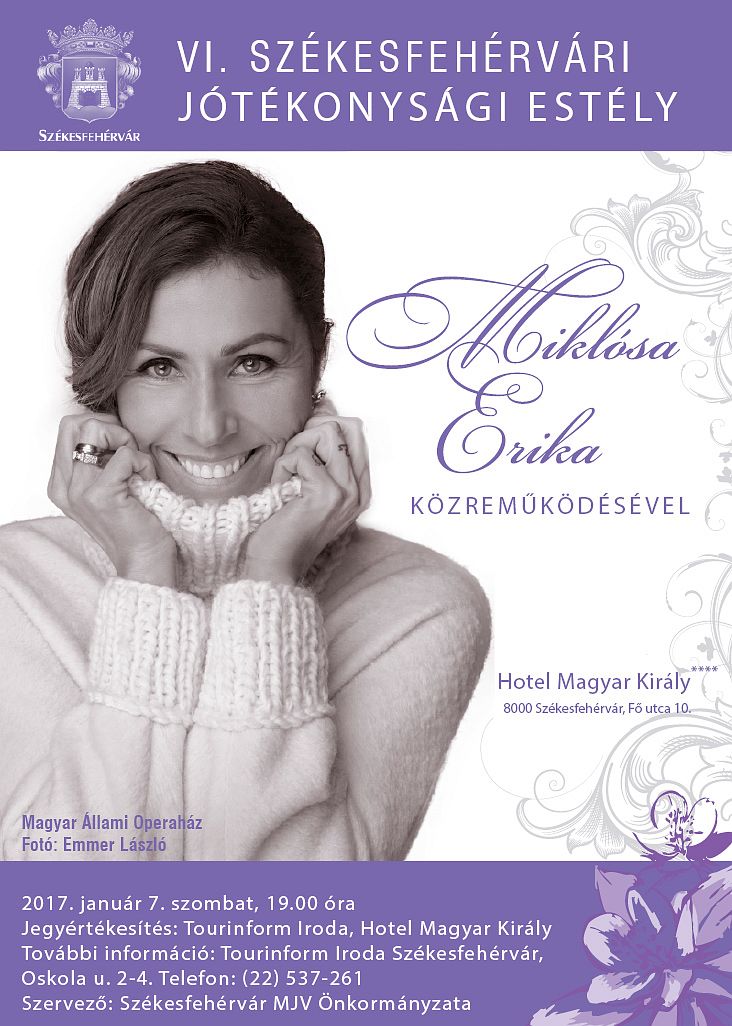 A VI. Székesfehérvári Jótékonysági Estélyt 2017. január 7-én, szombaton 19 órától tartják a Hotel Magyar Királyban. A támogatói jegyeket november végétől 40 ezer forintért lehet megvásárolni a Tourinform Irodában (készpénzes fizetési lehetőség) és az estély helyszínén (bankkártyás fizetési lehetőség). A nagyszabású rendezvény vendégei színvonalas kulturális műsort tekinthetnek meg az est háziasszonya, Miklósa Erika Kossuth-díjas operaénekesnő közreműködésével. Az exkluzív többfogásos vacsorát követően Jótékonysági Borárverést tartanak az elismert borász, Miklós Csabi vezetésével.
