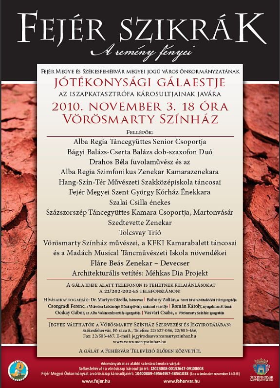 Összefogott a bajbajutottakért Székesfehérvár Önkormányzata, Fejér Megye Önkormányzata és a Közép-dunántúli Regionális Fejlesztési Ügynökség. Közös jótékonysági akciót szerveznek a vörösiszappal elárasztott területen élő emberek megsegítésére. A Fejér szikrák - a remény fényei címet viselő gálaestet november 3-án 18 órától rendezik meg a Vörösmarty Színházban. Minden fellépő ingyen vállalja szereplést, a jótékonysági estre a Vörösmarty Színházban lehet jegyet váltani.