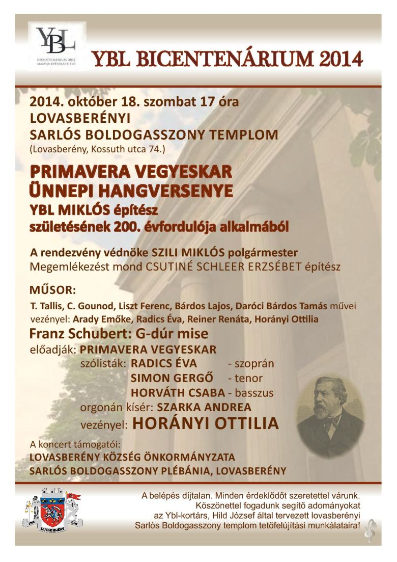 Október 18-án szombaton 17 órakor a lovasberényi Sarlós Boldogasszony templomban ünnepi hangversenyt tart a fehérvári Primavera vegyeskar az Ybl születésének 200. évfordulója alkalmából. A koncerten többek között Liszt Ferenc és Bárdos Lajos művei csendülnek fel és elhangzik Franz Schubert G-dúr miséje is. A belépés díjtalan,a segítő adományokat köszönettel fogadják az Ybl kortárs, Hild József által tervezett lovasberényi Sarlós Boldogasszony templom tetőfelújítási munkálataira.