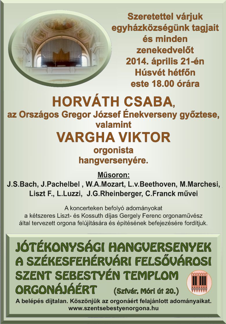 Április 21-én folytatódik a Szent Sebestyén templom orgonájának teljes felépítése érdekében szervezett koncertsorozat. A 18 órakor kezdődő jótékonysági hangversenyen fellép Horváth Csaba basszus énekes és Vargha Viktor orgonista. A kiváló akusztikájú templomban többek között J. S. Bach, Mozart, Beethoven, Marchesi, Liszt Ferenc és Rheinberger művei csendülnek fel.