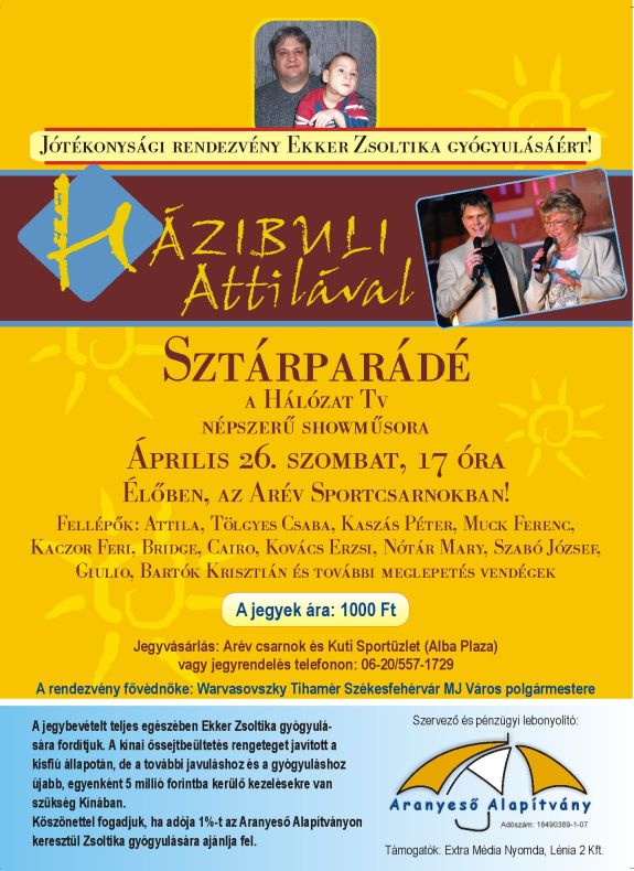 Jótékonysági sztárparádé lesz április 26-án szombaton az ARÉV Sportcsarnokban Ekker Zsoltika gyógyulásáért. A jegybevételt teljes egészében a kisfiú gyógyulására fordítják. A Hálózat Televízió népszerű sóműsorát élőben közvetítik a csarnokból, melyen fellép többek között Kaszás Péter, Tölgyes Csaba, Muck Ferenc, Kaczor Feri, a Bridge, a Cairo, Kovács Erzsi, Nótár Mary és Giulio is.