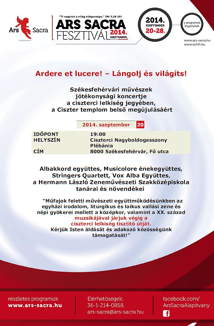 Az Ars Sacra Fesztivál keretén belül székesfehérvári művészek adnak jótékonysági koncertet adnak szombaton este hét órakor a ciszterci lelkiség jegyében a Ciszterci templom belső megújításáért. A koncerten fellép az Albakkord együttes, a Musicolore énekegyüttes, a Stringers Quartett, a Vox Alba együttes és a Hermann László Zeneiskola növendékei és tanárai.