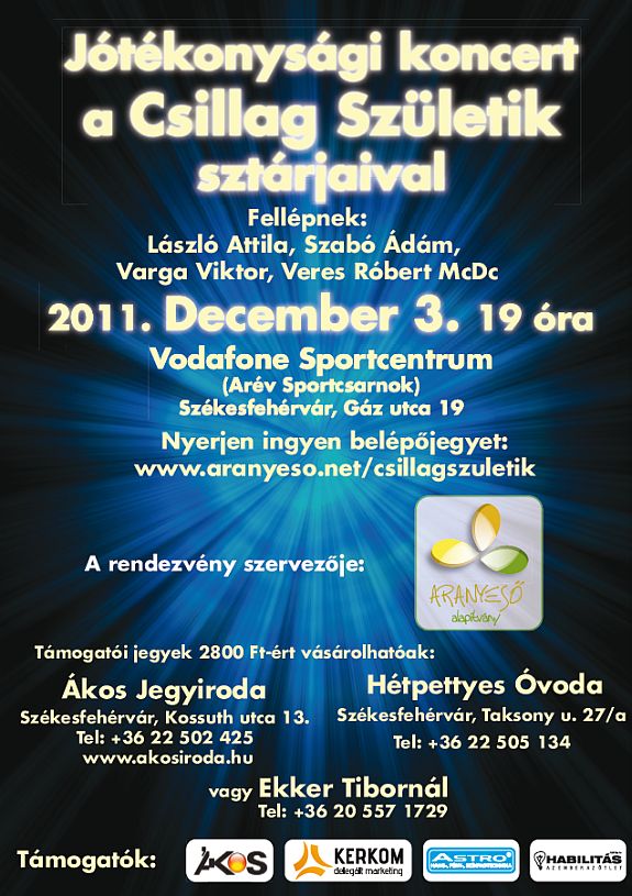 Jótékonysági koncertet szervez az Aranyeső Alapítvány december 3-án a Vodafone Sportcentrumban (ARÉV Sportcsarnok), melyen a Csillag Születik sztárjai lépnek színpadra. Fellépnek többek között László Attila, Szabó Ádám, Varga Viktor és Veres Róbert. Támogatói jegyek elővételben a Hétpettses Óvódában és az Ákos jegyirodában kaphatók.