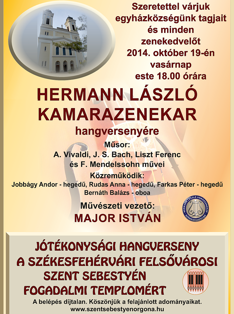 2014. október 19-én 18 órakor tartják az újabb évad következő jótékonysági koncertsorozatát a székesfehérvári Szent Sebestyén fogadalmi templomért. A koncerten Hermann László Kamarazenekar lép fel, melynek művészeti vezetője és karmestere Major István. Az eseményen Jobbágy Andor, Rudas Anna, Farkas Péter egyaránt hegedűn, míg Bernáth Balázs oboán működik közre, melyre díjtalan lesz a belépés.