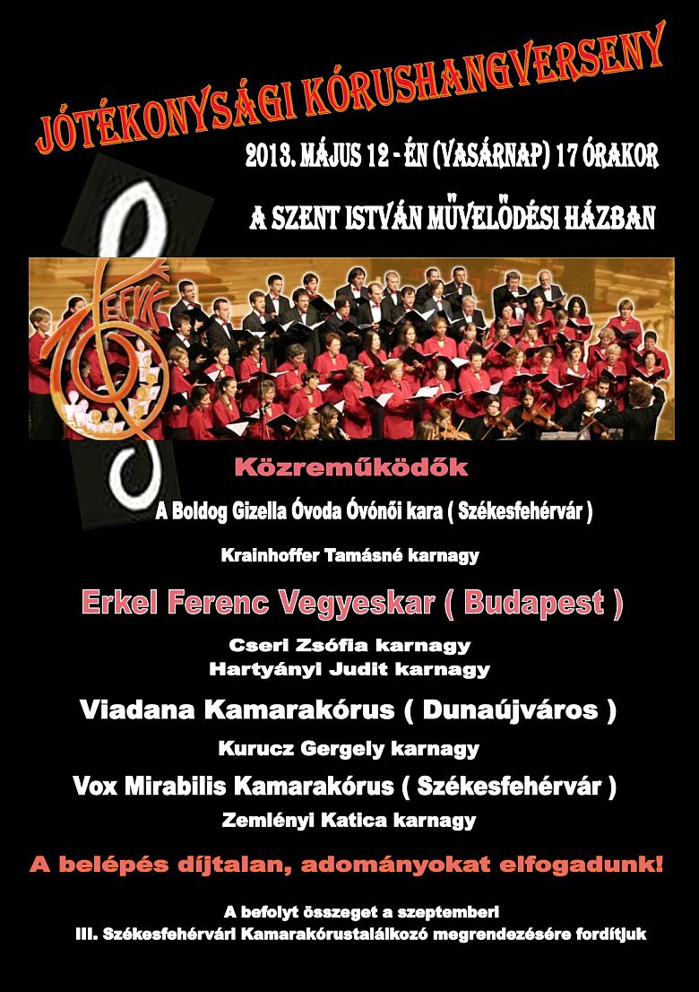 Jótékonysági kórushangverseny lesz május 12-én vasárnap 17 órakor a Szent István teremben, ahol az Erkel Ferenc Vegyeskar jótékonysági koncertje lesz Cseri Zsófia és Hartyányi Judit vezényletével. Közreműködik a Viadana Kamarakórus és a Vox Mirabilis Kamarakórus. A komolyzenei koncert bevételét a szeptemberi III. Székesfehérvári Kamarakórus Fesztivál megrendezésére fordítják.