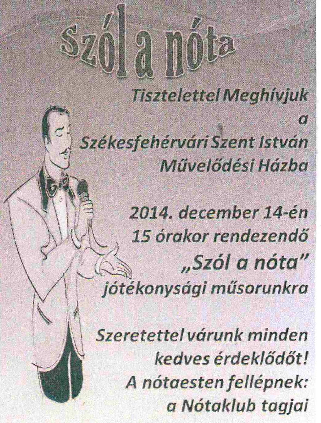 „Szól a nóta” címmel idén is megszervezi a jótékonysági programját a Fehérvári Nóta Klub. December 14-én, vasárnap 15 órától a Szent István Művelődési Házban. A Klub tíz tagja a két részes zenés programban karácsonyi dalokkal és magyar nótákkal lépnek színpadra.