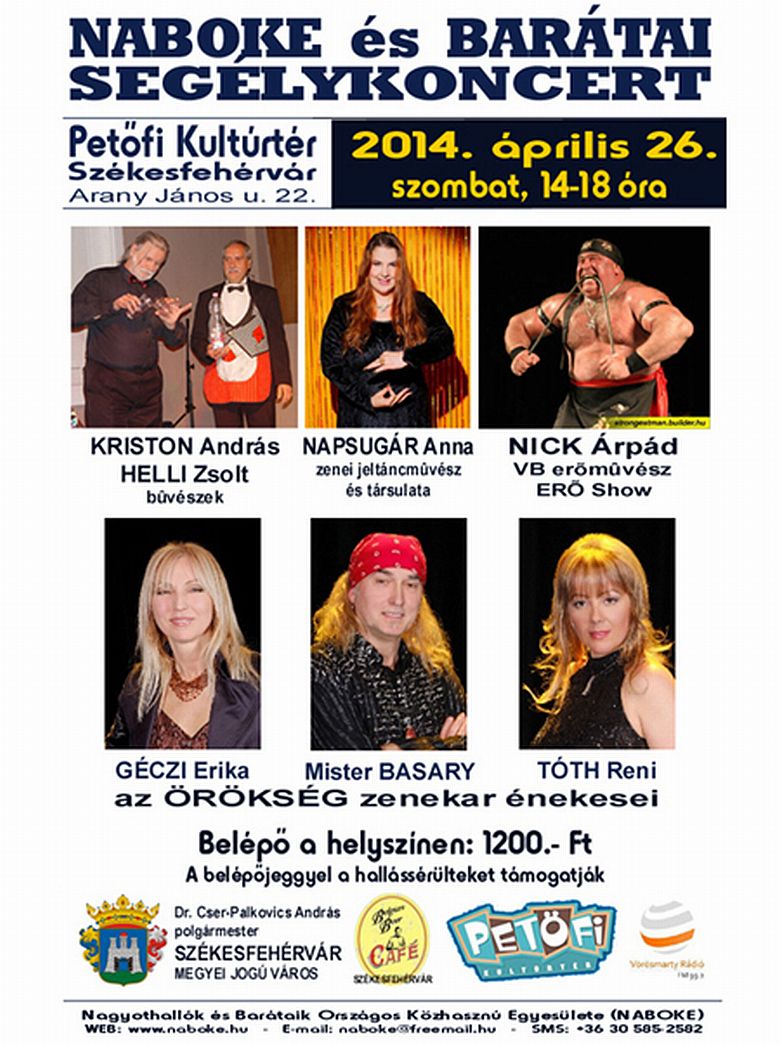 Április 26-án, szombaton 14-18 óra között rendezik meg a NABOKE ÉS BARÁTAI SEGÉLYKONCERT a Petőfi kultúrtérben (volt Petőfi mozi), az Arany János u. 22. szám alatt. Az 1.200 Ft-os belépő megvásárlásával a hallássérülteket, és a NABOKE egyesület működését segíthetik. A négyórás programon többek között Kriston András és Helli Zsolt bűvészek, Nick Árpád VB-erőművész, valamint Napsugár Anna zenei jeltáncművész és társulatának tekinthetik meg a produkcióját.