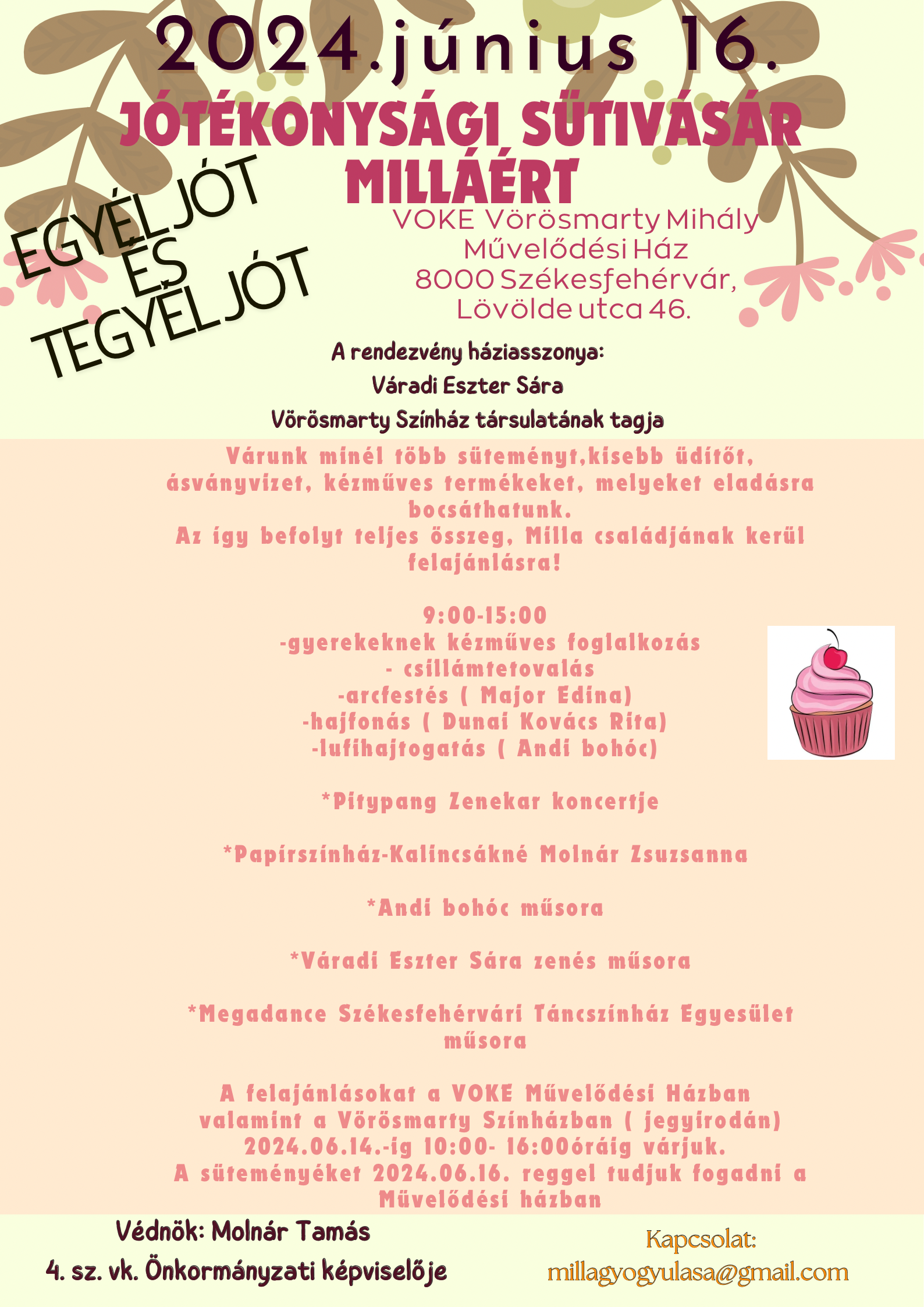 Gáspár – Tóth Katalin és Pálfi – Molnár Anita tartós élelmiszereket és kozmetikai eszközöket gyűjtöttek korábban– azonban ezek mellett anyagi segítségre ugyanúgy szüksége van a családnak, akiknek fél éve teljesen felfordult az élete. Június 16-án, vasárnap, a VOKE Művelődési Házban egy jótékonysági sütivásáron gyűjtenek majd Milla gyógykezelésére. ”Ez egy családiasabb rendezvény lesz. Rengeteg gyerek programmal, koncertekkel, arcfestéssel, lufihajtogatással - Andi bohóc is ott lesz! Bízunk benne, hogy sokan érkeznek majd és támogatják Milla felépülését!" - invitált mindenkit a sütivásárra Gáspár -Tóth Katalin, ötletgazda.