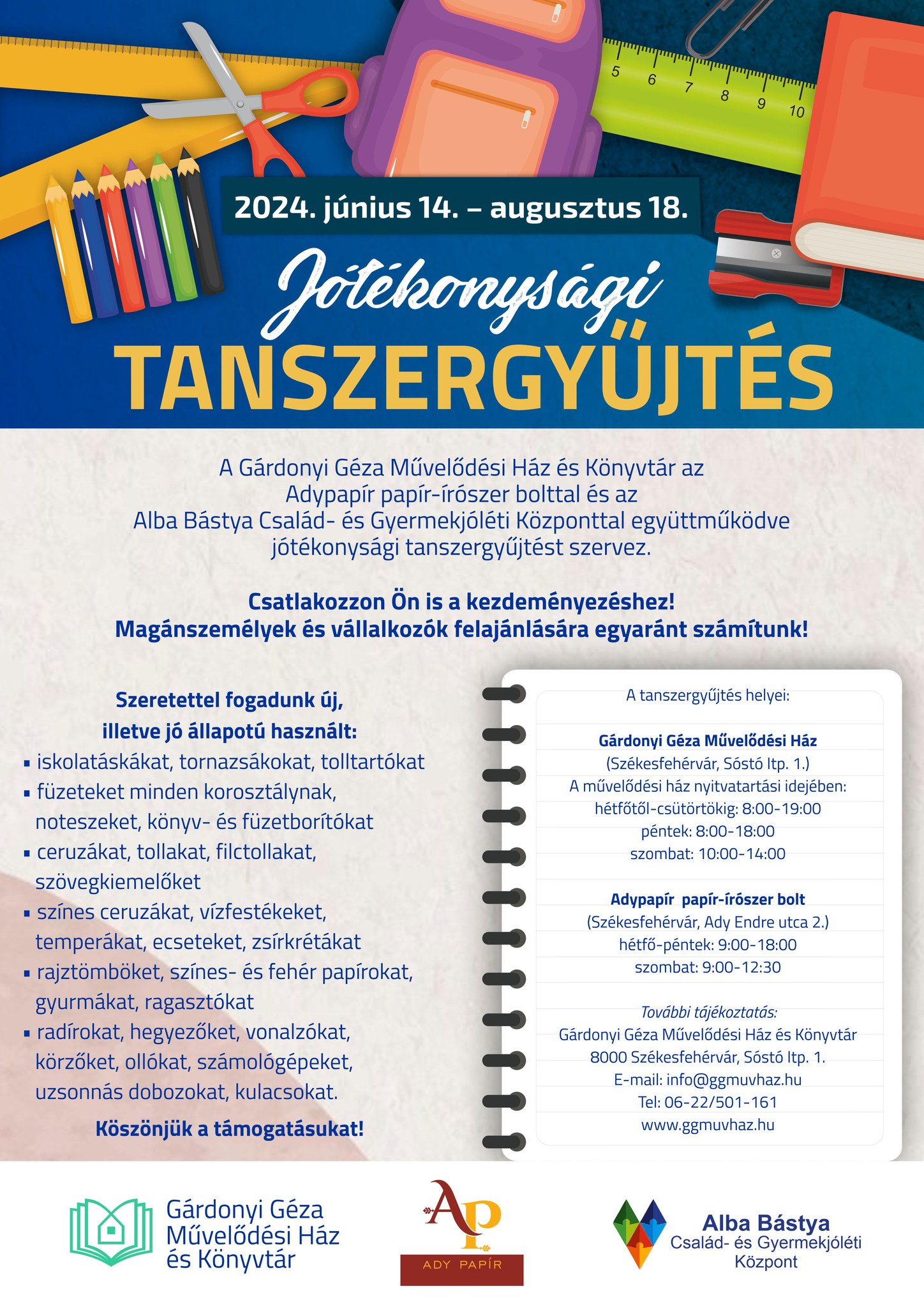 Már a következő tanévre készülve, egész nyáron át tartó jótékonysági tanszergyűjtést szervez a Gárdonyi Géza Művelődési Ház és Könyvtár az Adypapír papír-írószer bolttal és az Alba Bástya Család- és Gyermekjóléti Központtal közösen.