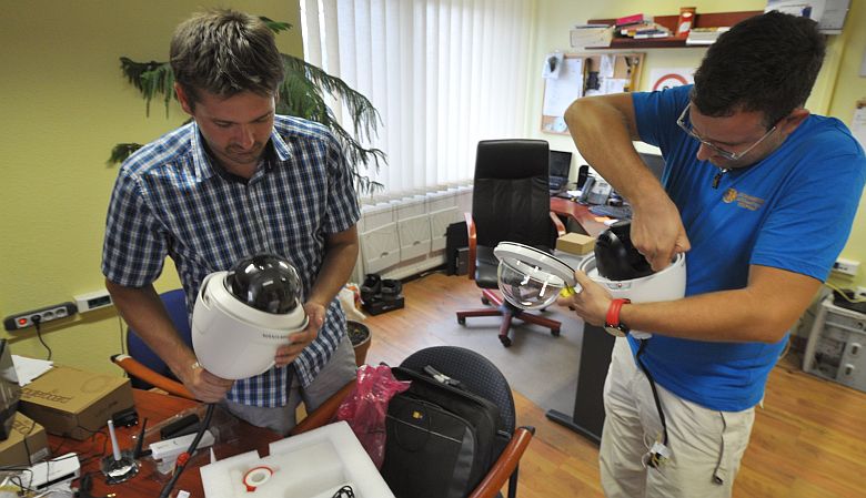 Csikós Gábor hálózati mérnök és Joó Gábor rendszergazda a kamerák fejegységeit készítik elő a rendszerbe illesztéshez.Barabás Tibor, az Önkormányzati Informatikai Központ vezetője elmondta, hogy a múlt héten újabb tizenöt Full HD kamera érkezett az önkormányzati céghez, melyek felszerelése a jövő héten kezdődik meg a Hübner András utcában. A lakótelepen a tervek szerint szeptemberre elkészül a rendszer. A legnagyobb munka nem a kamerák felszerelése, hanem az ehhez tartozó vezetékrendszer megépítése. A kameraképek optikai hálózaton keresztül és vezeték nélküli technológiával jutnak el a Városház téri térfigyelő központba. A kamerák fejegységeit a cég Honvéd utcai központjában készítik elő szerelésre. A fejegységek minden irányba forgathatók, és harmincszoros optikai nagyításra képesek.