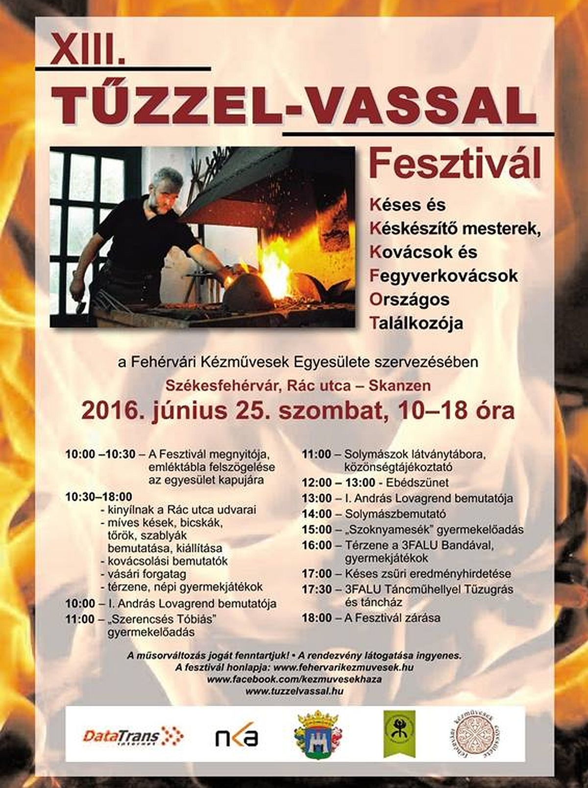 A Fehérvári Kézművesek Egyesületének szervezésében a XIII. Tűzzel-vassal Fesztiválra várják jövő szombaton az érdeklődőket a Skanzenbe. A Rác utca teljes hosszában a késesek, kovácsok és Fegyverművesek Országos Találkozójára idén is sok szakembert várunk, míves bicskákat, tőröket, érdekes fegyvereket lehet megcsodálni.