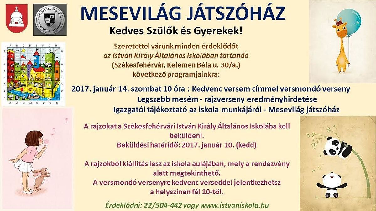„Legszebb mesém” címmel hirdetett rajzversenyt nagycsoportos óvodások számára a Székesfehérvári István Király Általános Iskola. Az alkotásokat 2017. január 10-ig kell beküldeni az intézménybe. Az eredményhirdetés január 14-én, szombaton lesz, akárcsak a versmondó verseny is, ahova kedvenc versükkel nevezhetnek a gyerekek a helyszínen.
