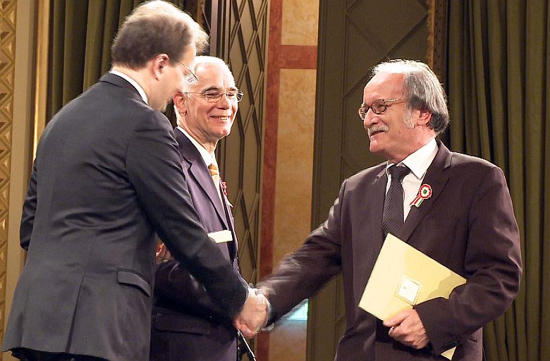 A díjátadás pillanata: Hoppál Péter államtitkár, Balog Zoltán miniszter és Bakonyi István.Hittel élő ember vagy?