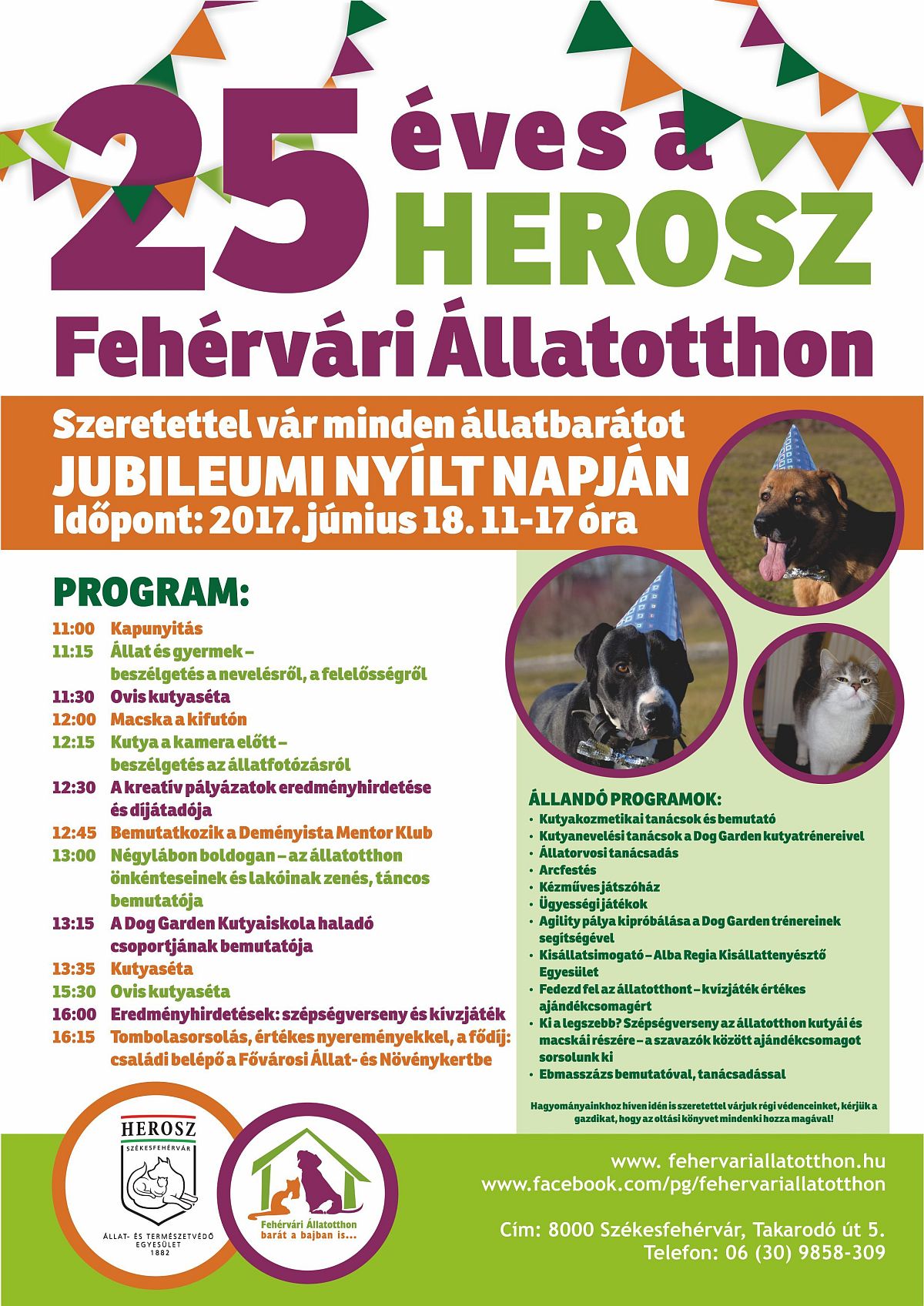 Negyedszázados fennállását ünnepli idén a HEROSZ Fehérvári Állatotthona. A decemberig tartó jubileumi rendezvénysorozat kiemelt eseménye lesz a június 18-i, vasárnapi nyílt nap, amely minden eddiginél színesebb programsorozattal várja az állatbarát gyerekeket és felnőtteket egyaránt, 11.00 és 17.00 óra között.