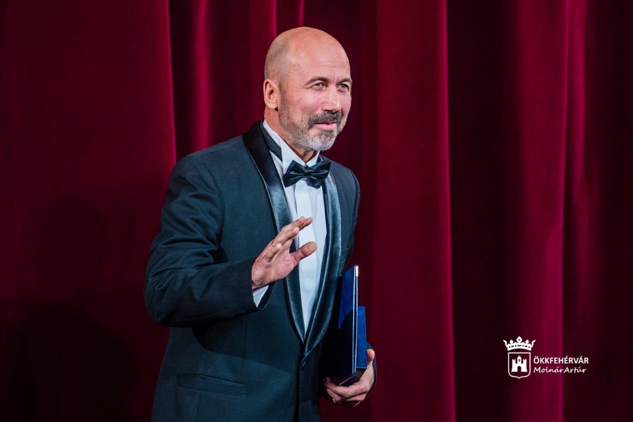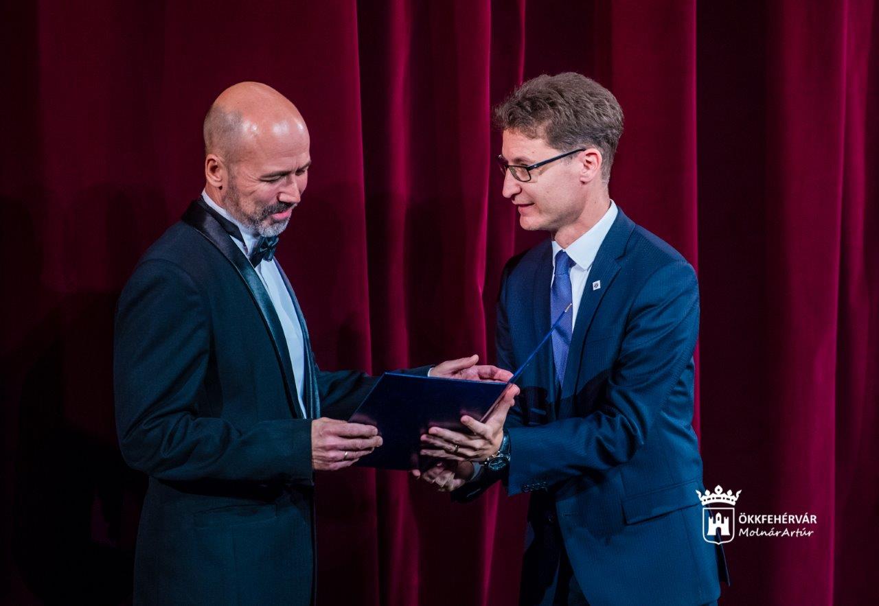 "25 évaddal ezelőtt hozott az akkori önkormányzat egy jó és fontos döntést a város életében azzal, hogy úgy döntött, önálló társulatot alapít és elindul ezen a nem mindig könnyű, de annál fontosabb úton. Azt kérem, hogy a mai tapsunk azoknak a döntéshozóknak szóljon, akik közéleti szereplőként, vagy szakemberként hittek Fehérvában és művészként adták saját hitelességüket, hogy ezen az úton elindulhattunk. Ennek nyomán néhány évvel később idekerült egy fiatal színész, aki ma már hozzátartozik ehhez a színházhoz és ehhez a városhoz." - köszöntötte a közönséget és a díjazottat Cser-Palkovics András polgármester.