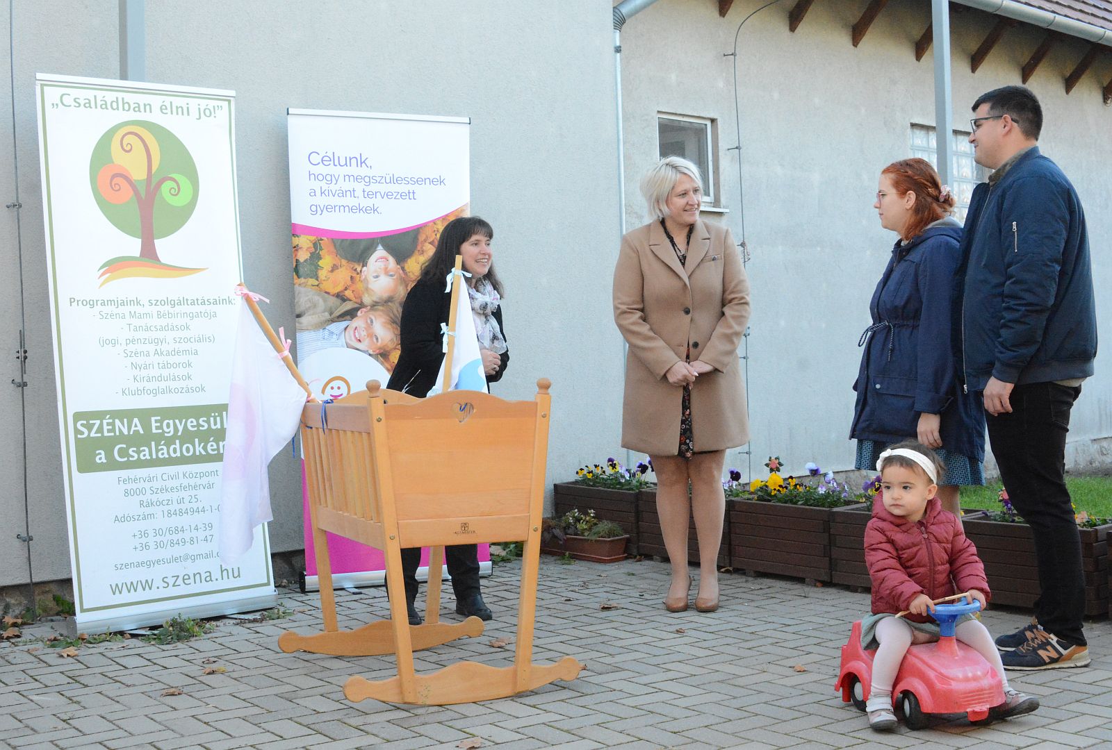 Deák Lajosné önkormányzati képviselő, családügyi tanácsnok és Bálesné Elekes Rita a SZÉNA Egyesület a Családokért civil szervezet elnöke adta át Magda Istvánnak és Fanninak Fehérvár Bölcsőjét a Csibészke- és Zöldliget Családi Bölcsőde udvarán.