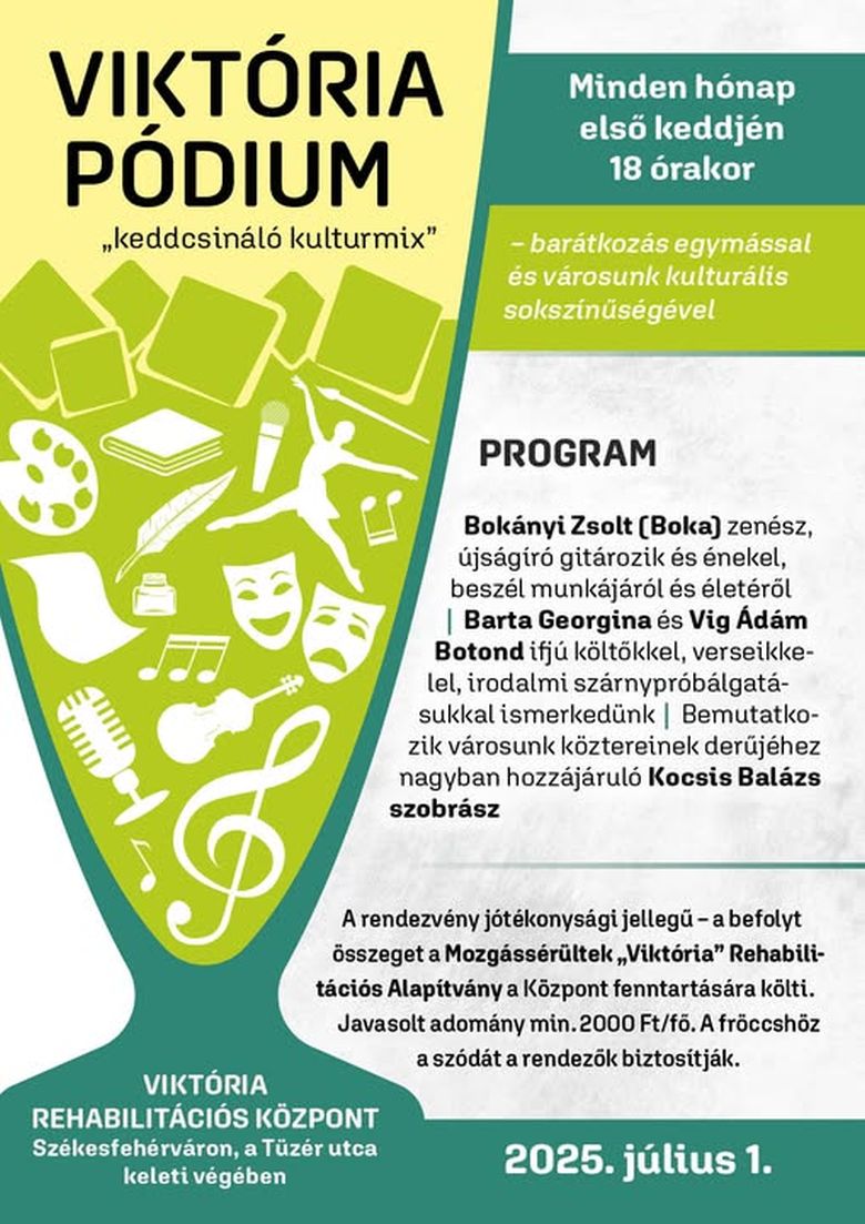 A Viktória Pódium „keddcsináló kulturmix” minden hónap első keddjén a Viktória Rehabilitációs Központ nagytermében tartalmas beszélgetéssekkel, helyi érdekességekkel várja a közönséget.