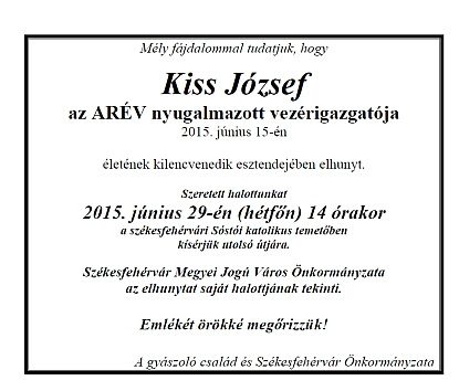 Június 29-én, hétfőn 14 órakor vesznek végső búcsút a Sóstói katolikus temetőben, az életének 90. évében elhunyt Kiss Józseftől, az ARÉV egykori vezérigazgatója, az ARÉV Baráti Kör Egyesület volt elnöke, akinek kiemelkedő városépítői tevékenységét a közgyűlés Pro Civitate kitüntetéssel ismerte el. Kiss Józsefet Székesfehérvár Önkormányzata saját halottjának tekinti.