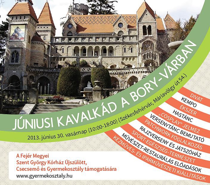 A Fejér Megyei Szent György Kórház Újszülött, Csecsemő és Gyermekosztályának támogatására Júniusi Kavalkádot rendeznek a Máriavölgyben a hónap utolsó vasárnapján. Látványos tánc- és sportbemutatókkal, érdekes, az egészséges életmódról szóló előadásokkal, kézműves foglalkozásokkal és rajzversennyel várják az érdeklődőket június 30-án, vasárnap a Bory-várban.