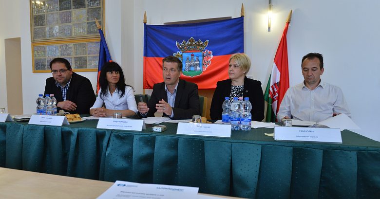 Steigerwald Tibor a Depónia Nonprofit Kft. ügyvezető igazgatója az érintett városrészek önkormányzati képviselőivel, Östör Annamáriával, Deák Lajosnével, Mészáros Attilával és Földi Zoltánnal közösen tartott sajtótájékoztatót a júniustól bevezetésre kerülő kétfrakciós hulladékgyűjtésről.
