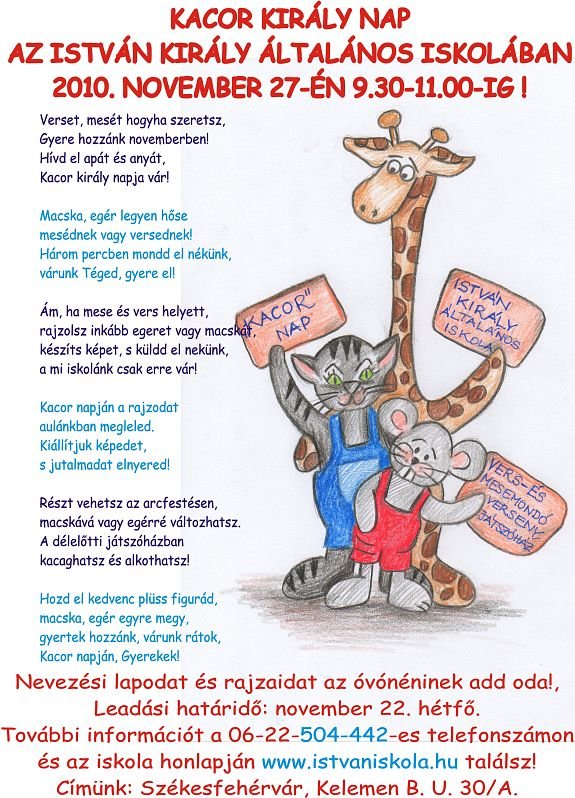 Kacor kirány napot tartanak óvodásoknak november 27-én délelőtt az István Király Általános Iskolában. A programra jövő héten hétfőig jelentkezhetnek az óvodások saját rajzaikkal, amit az óvónéniknek kell odaadni. a leadási határidő november 22-én hétfőn lesz. A rajzokból a Kacor király napon kiállítást is rendeznek az iskola aulájában, de lesz játszóház, arcfestés és megannyi színes gyerekprogram, melyre az ovisok szüleit is várják.