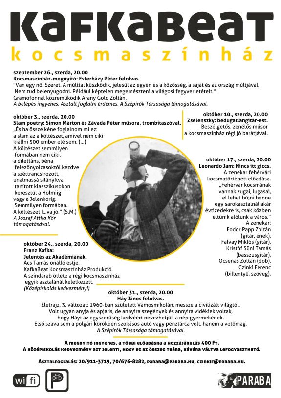 Október 17-én és október 24-én folytatódnak a Kafkabeat Kocsmaszínház eseményei a Jancsár köz 4. szám alatt, a Paraba színpadán. Október 17-én szerdán 20 órától a Leonardo Jam kocsmatörténeti előadását láthatjuk, október 24-én szerdán pedig Ács Tamás, a Soproni Petőfi Színház művészének önálló estje következik, aki Kafka: Jelentés az Akadémiának című művéből ad elő.