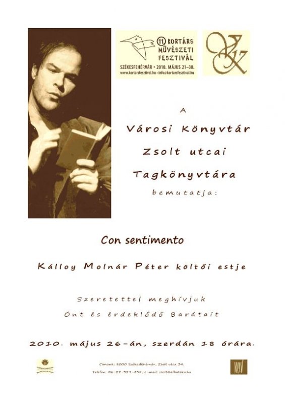Május 22-én vette kezdetét a két hétig tartó Kortás Művészeti Fesztivál. Az eseménysorozat során szinte minden művészeti ág és műfaj képviselteti magát. De a fesztivál nem csupán a városunkban alkatók számára nyújt lehetőségeket, hanem célja az is, hogy alkotások, produkciók érkezzenek Székesfehérvárra, ezzel is inspirálva a helyi művészeket. Ennek kapcsán 26-án, szerdán Kálloy Molnár Péter Költői Estje kerül megrendezésre a Városi Könyvtár Zsolt utcai Tagkönyvtárában.