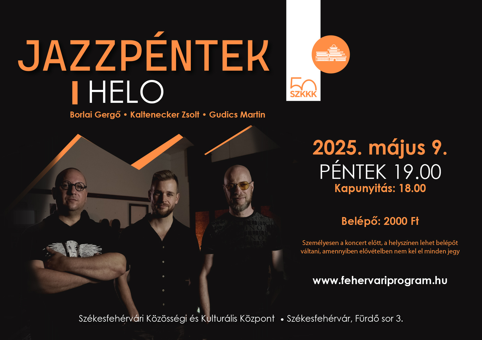 Borlai Gergő, Kaltenecker Zsolt és Gudics Martin új triója, a HELO lép fel a Székesfehérvári Közösségi és Kulturális Központ Jazzpéntekjeinek sorozatában május 9-én 19 órakor az intézmény Fürdő sori épületében.