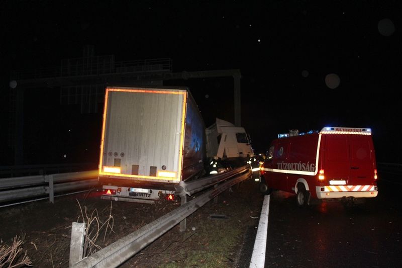 A két pályatestet elválasztó zöldsávban állt meg az a nyerges vontató, amely átszakította a belső szalagkorlátot, és egy betonoszlopnak ütközött éjszaka az M7-es autópályán, Székesfehérvárnál. A huszonnégy tonna betonvasat szállító kamion vezetőfülkéjének ajtaja eldeformálódott, ezért a sofőr nem tudott kiszállni.