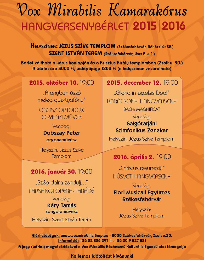 Orosz ortodox egyházi művek, karácsonyi koncert, farsangi opera-parádé és húsvéti hangverseny szerepel a Vox Mirabilis Kamarakórus 2015/2016-os évadának repertoárjában. Bérletek már kaphatók. Neves szólisták és vendégegyüttesek, valamint csodaszép zeneművek várják az érdeklődőket négy szombaton is.