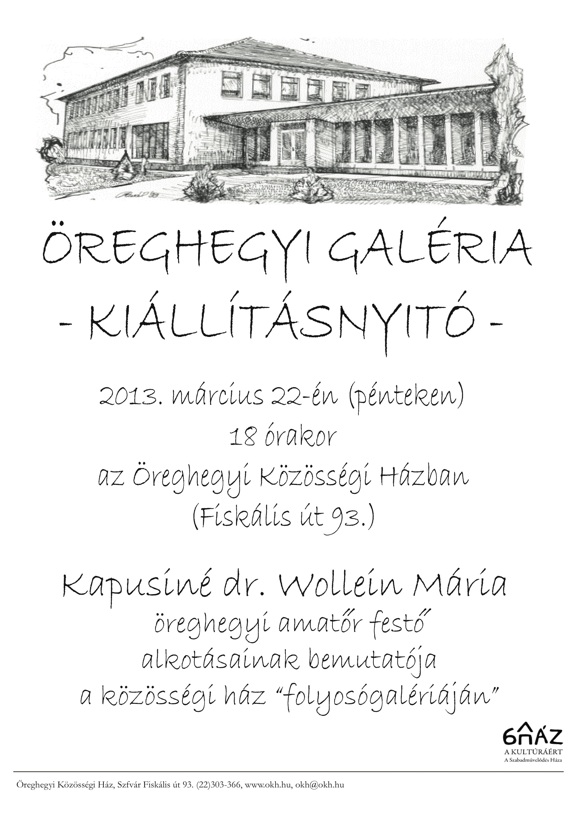 Időről időre egy-egy öreghegyi amatőr képzőművész alkotásaival töltik meg az emeleti folyosó falait az Öreghegyi Közösségi Házban. Elsőként Kapusiné dr. Wollein Mária festőművész képeit lesznek láthatóak. Az öreghegyi amatőr festő tárlata március 22-én pénteken 18 órakor nyílik meg. A kiállítás május 19-ig látható az intézmény nyitvatartási idejében a közösségi ház folyosógalériáján.