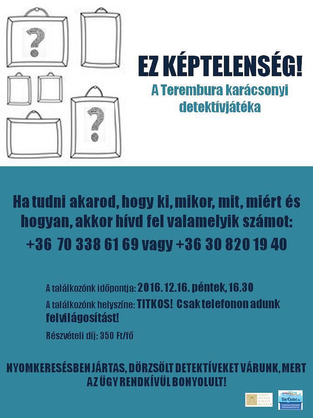 Nyom- keresésben jártas, dörzsölt detektíveket keresnek egy rendkívül bonyolult ügyhöz. Pénteken délután 16.30 órakor „Ez képtelenség!” címmel karácsonyi detektívjáték lesz az Új Magyar Képtárban a Terembura Egyesülettel. A programról érdeklődni a +36 70 338 61 69 vagy a +36 30 820 19 40 telefonszámokon lehet.