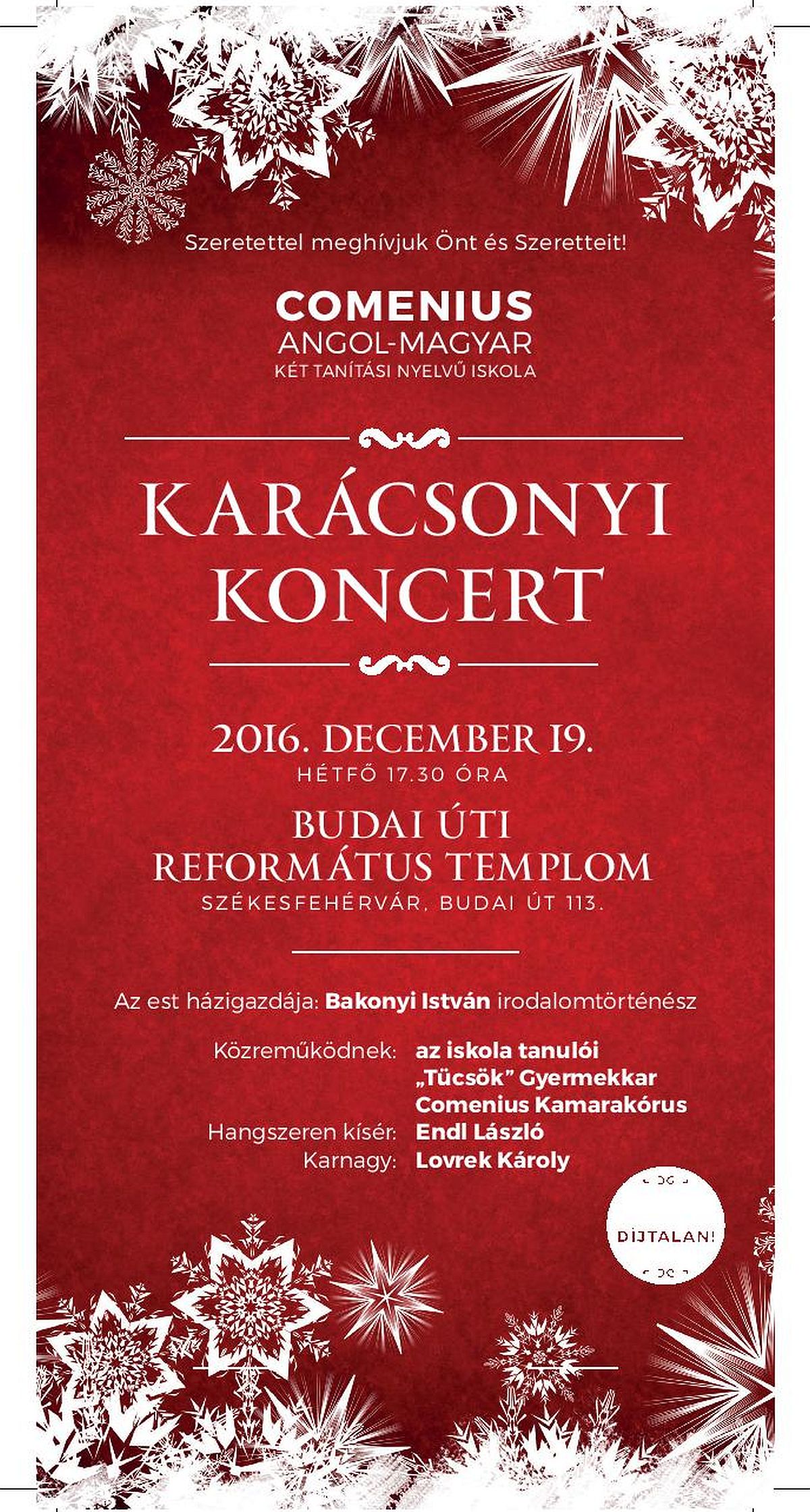 Hétfőn 17.30 órakor kezdődik a Comenius Angol-Magyar Két Tanítási Nyelvű Gimnázium karácsonyi koncertje. A kulturális eseményen közreműködnek az iskola tanulói, a „Tücsök” Gyermekkar és a Comenius Kamarakórus. Az est házigazdája Bakonyi István irodalomtörténész. Minden érdeklődőt szeretettel várnak a rendezvényre!