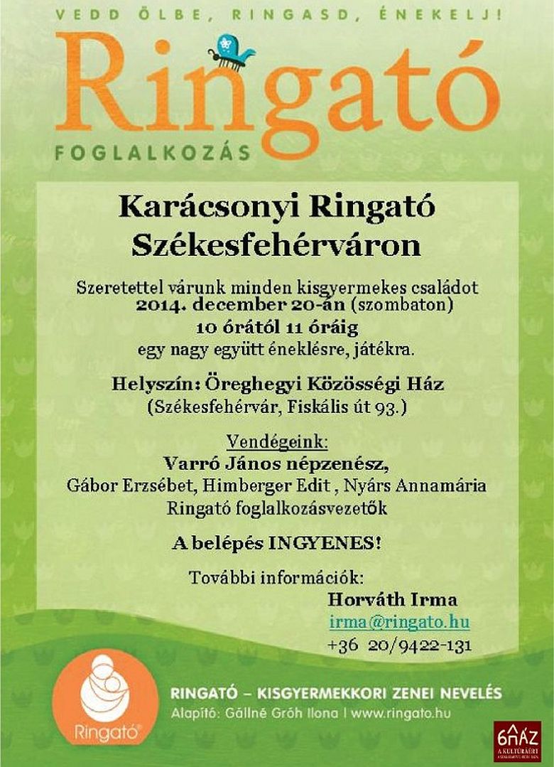 2014. december 20-án, szombaton Karácsonyi Ringató névvel szerveznek programot az Öreghegyi Közösségi Házban (Székesfehérvár, Fiskális út 93.). Az esemény szervezői sok szeretettel várnak minden kisgyermekes családot egy nagy éneklésre és közös játékra délelőtt 10-től 11 óráig. A program vendégei Varró János népzenész, Gábor Erzsébet, Himberger Edit és Nyirs Annamária Ringató foglalkozásvezetők lesznek. A rendezvényre ingyenes lesz a belépés.