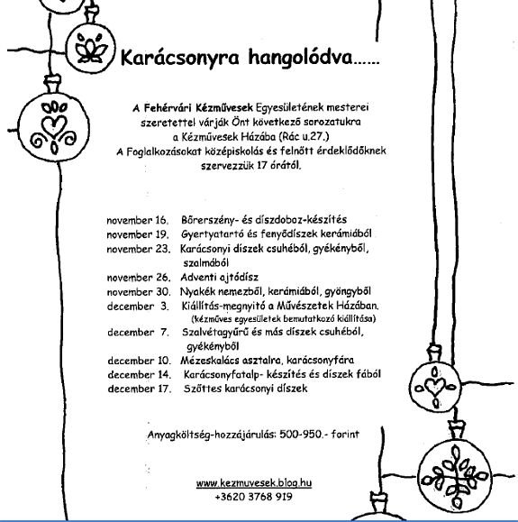 A Fehérvári Kézművesek Egyesülete a sikeres októberi programsorozata után újabb bekapcsolódási lehetőséget kínál a kézművesség világába. Az alkotás iránt érdeklődő felnőtteknek, középiskolás diákoknak keddenként és péntekenként 17 órától a Kézművesek Házában Székesfehérváron a Rác u. 27. szám alatt. Bőrerszényt, díszdobozt, karácsonyi díszeket, adventi ajtódíszt, karácsonyfatalpat, mézeskalácsot, nemezből készült termékeket és szőttes karácsonyi díszek készítését tanulhatják meg az érdeklődők.