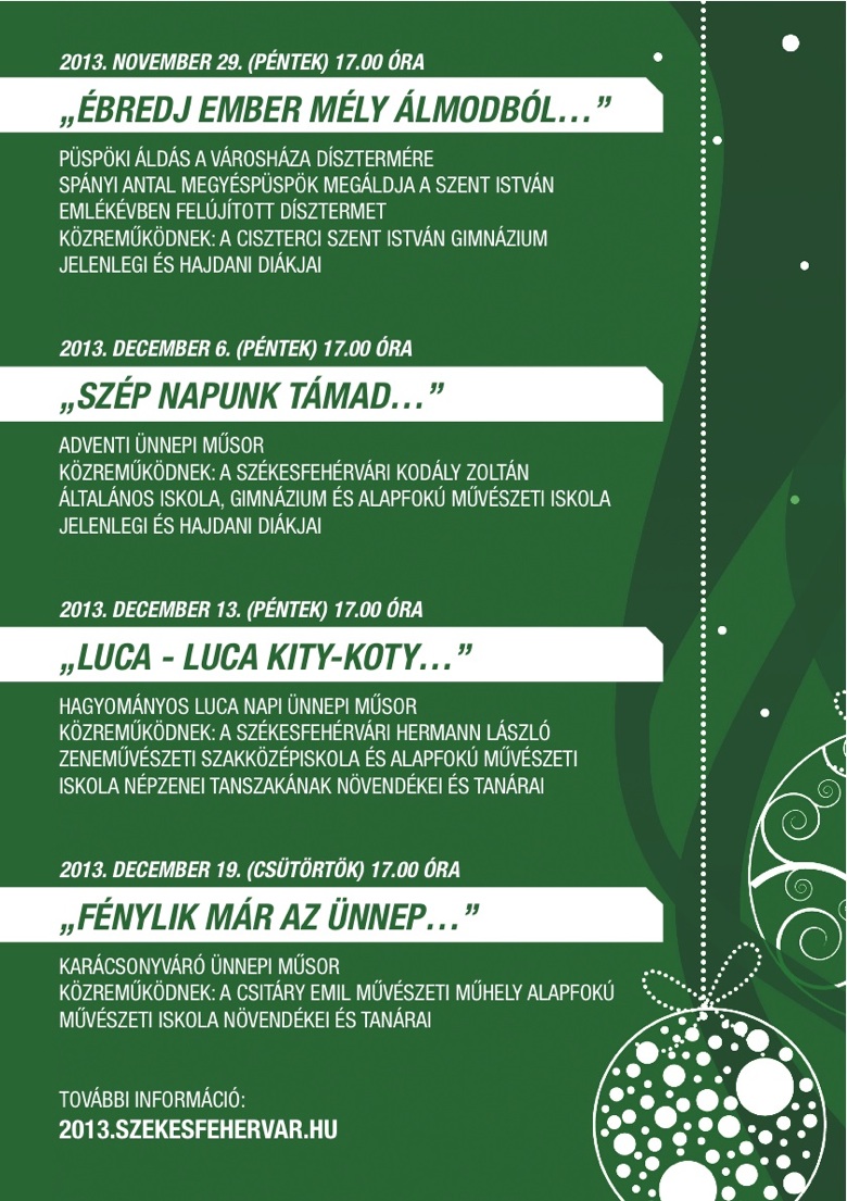 Karácsonyváró rendezvényeknek ad helyet a Városháza Díszterme november 29-e és december 19-e között. November 29-én 17 órakor Spányi Antal megyéspüspök megáldja a Szent István Emlékévben felújított Dísztermet, az ünnepi műsorban közreműködnek a Ciszterci Szent István Gimnázium jelenlegi és hajdani diákjai is.