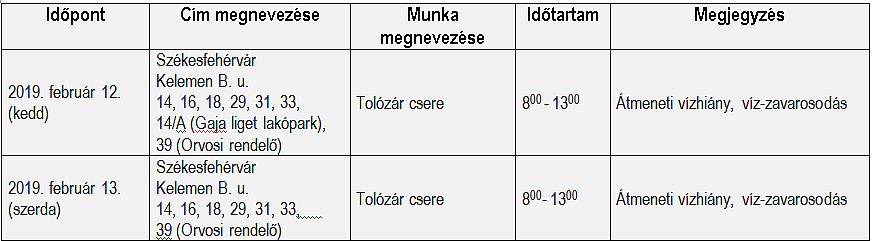 A Fejérvíz Zrt. tájékoztatja az érintett fogyasztókat, hogy február 12-13-án kedden és szerdán, 8:00 és 13:00 óra között, előre tervezett karbantartási munkákat végeznek. Ezeken a napokon a Kelemen Béla utcában több házban átmeneti vízhiány várható, ezért kérik, hogy a kellemetlenségekre készüljenek fel, gondoskodjanak háztartásukhoz elegendő vízmennyiség vételéről.