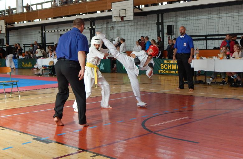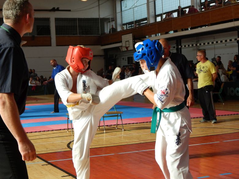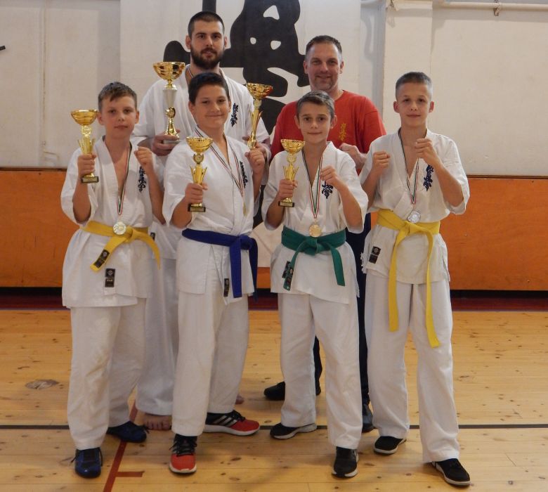 Itt is volt két újonc a csapatban. A gyermek korosztályban, pontversenyben már kitűnő eredményeket magáénak mondható Kovács Máté, most ezen a keményebb megmérettetésen sem vallott szégyent. Első KO. versenyén szó szerint elverte valamennyi ellenfelét. Ez a teljesítménye az iskolában ugyan intőt érdemelne, itt viszont egy gyönyörűen csillogó aranyérmet és eredményezett, amit shihan Gyarmati Imre, a verseny szervezője akasztott a nyakába.