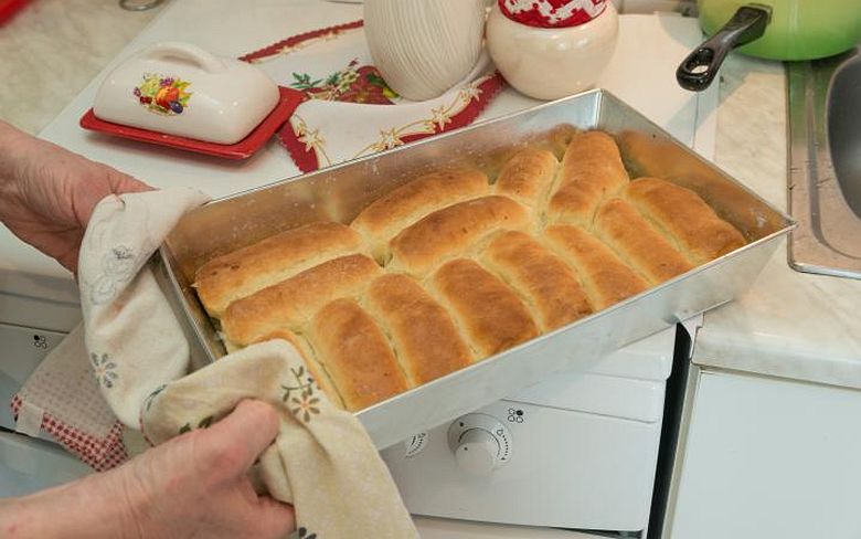 Kata néni a kis tekercseket külön-külön is megolajozta, hogy ne ragadjanak össze. A tetejüket megkente egy kis tejjel, amitől a kis tésztaregiment úgy sül szép pirosra, hogy közben foszlósan puha marad.A kétszáz fokos sütőben a bukták húsz perc alatt elkészültük. Persze a gondos háziasszony közben fél szemmel néha rájuk pillantott, és félidőben ismét átkente őket tejjel, hogy a végeredmény tökéletes legyen.