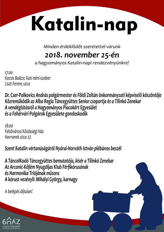 Kati néni szobránál a Fehérvári Piacosok és a Fehérvári Polgárok Egyesülete a Tilinkó zenekarral köszöntik a Katalinokat – mondta Kiss Dorottya a a Szabadművelődés Háza igazgatója. Az Arconic-Köfém férfikara bordalokat énekel majd, de lesz ludaskása, libateepertő, meleg tea is a Felsővárosi Közösségi Házban.