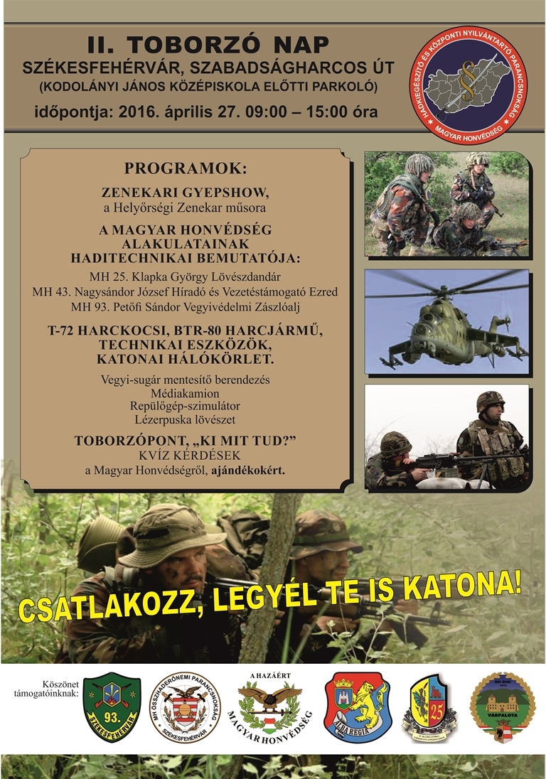 A rendezvény célja, hogy az érdeklődők hiteles képet kapjanak a katonai szolgálatvállalás lehetőségeiről és formáiról, a toborzón szó lesz a juttatásokról, illetve a bekerülés feltételeiről is. Az eseményen képviselteti magát a Magyar Honvédség 43. Nagysándor József Híradó és Vezetéstámogató Ezrede, a Magyar Honvédség 93. Petőfi Sándor Vegyivédelmi Zászlóalja, a Magyar Honvédség 25. Klapka György Lövészdandárja és a Magyar Honvédség Bakony Harckiképző Központja is, akik látványos haditechnikai bemutató keretében népszerűsítik alakulatukat.