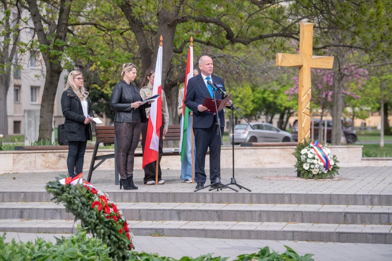 Az emléknap hétfőn délután a Székesfehérvári Lengyel Nemzetiségi Önkormányzat megemlékezésével folytatódott a katyńi vérengzés és a 2010-es smolensk-i repülőgép baleset áldozatainak tiszteletére. A magyar, majd a lengyel himnusz elhangzása után Szalai Tamás, a nemzetiségi önkormányzati elnöke mondott beszédet. „A rendszerváltás óta eltelt nagyjából 35 év alatt a bukott kommunista rendszer egyik, ha nem a legnagyobb a „szekrényből kieső csontváza” Katyń. Ma már nyíltan, félelem nélkül tudunk beszélni a világ ezen részén az 1940-ben történt, emberi aggyal fel nem fogható tisztogatásról, tömeggyilkosság-sorozatról.” – fogalmazott, majd részletesen felelevenítette a háborús bűncselekmény történetét. Hozzátette, az országban több helyen kopjafák, emléktáblák, tölgyfalevelek, monumentális erdőket megformáló alkotások őrzik Katyń és Smolensk emlékét, de csak néhány helyen van kereszt. Szalai Tamás köszönetét fejezte ki Székesfehérvár városvezetésének a Katyń emlékkereszt felállításáért és közvetlen környezetének gondozásáért.