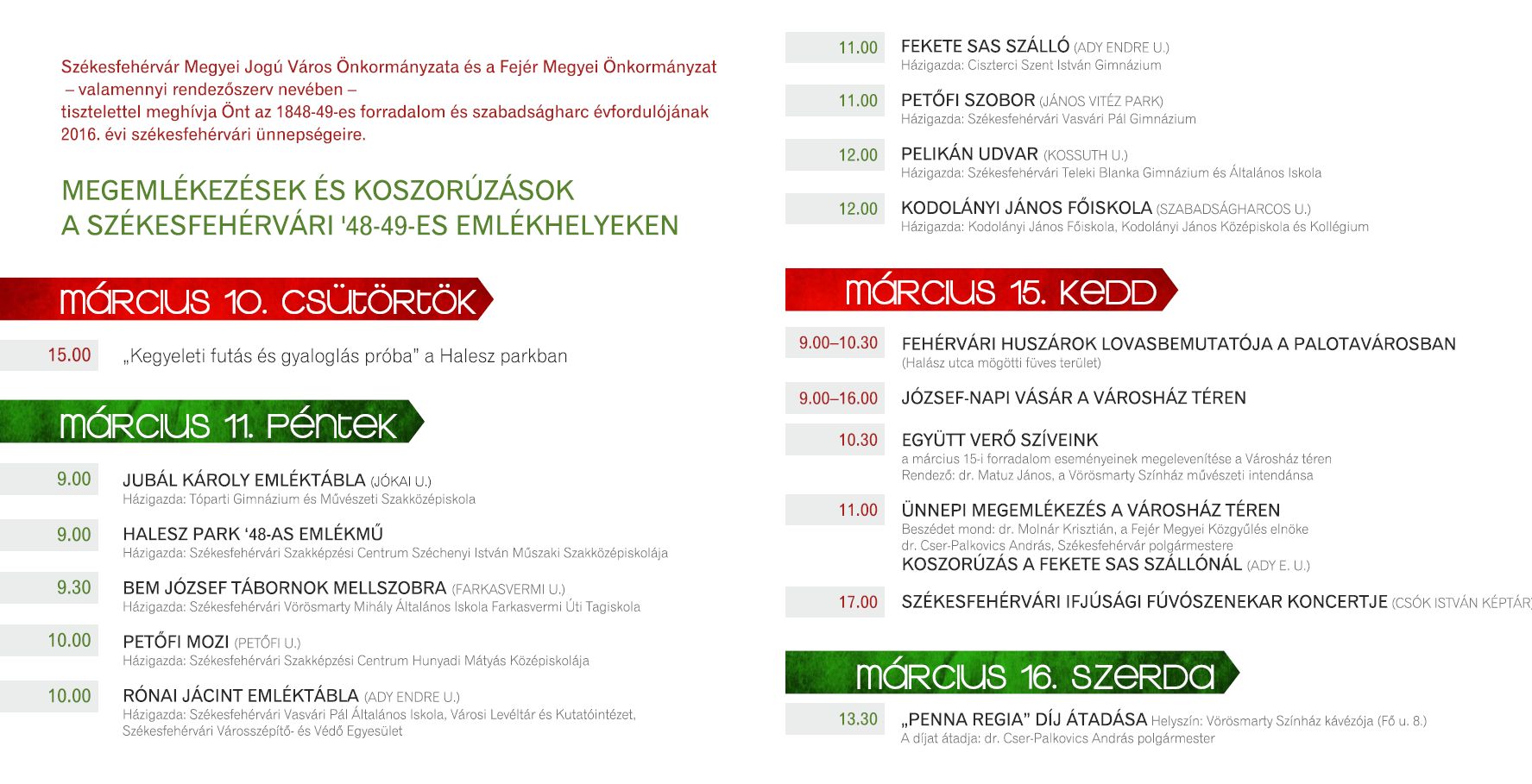 A nemzeti ünnepen, március 15-én, kedden 10.30 órától „Együtt verő szíveink” címmel adnak ünnepi műsort dr. Matuz János rendezésében Székesfehérvár lelkes ifjú színjátszói a Városház téren, az előadást Cserta Balázs zenekara kíséri. Az ünnepi megemlékezésen 11 órakor beszédet mond dr. Molnár Krisztián, a Fejér Megyei Közgyűlés elnöke és dr. Cser-Palkovics András, Székesfehérvár polgármestere. A város délelőtti programjait koszorúzás zárja a Fekete Sas Szállónál. Az ünnepi műsort délután 14 órakor megismétlik a Városháza előtti kőemelvényen.