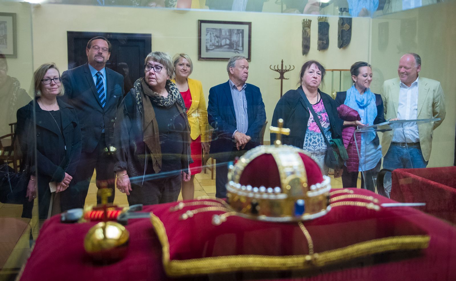 Székesfehérvárra érkezett pénteken két testvérvárosi delegáció, hogy részt vegyenek a hétvégi városi programokon. A finnországbeli Kemiből három, a német Schwäbisch Gmündből két vendéget fogadott Deák Lajosné tanácsnok a Városházán, és megmutatta a koronázási ékszereket, illetve a Díszteremről tartott ismertetőt.