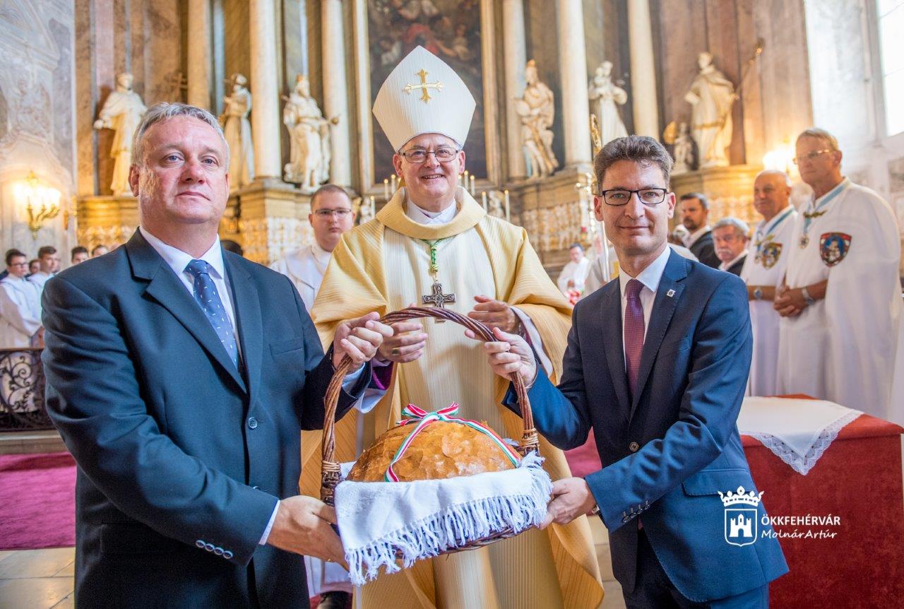 A megáldott kenyeret Spányi Antal szimbolikusan Dr. Simon László, kormánymegbízottnak, a Fejér Megyei Kormányhivatal vezetőjének és Dr. Cser-Palkovics András polgármesternek adta át.